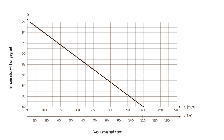 TemperaturwirkungsgradTemperaturwirkungsgrad als Funktion des Volumenstroms qv [m3/h] für Gerät mit Gegenstromzähler. Temperaturwirkungsgrad nach EN13141-7 (2°C / 20°C). NB! Der Temperaturwirkungsgrad ist für den Gegenstromwärmetauscher allein (ohne Wärmepumpebetrieb). |