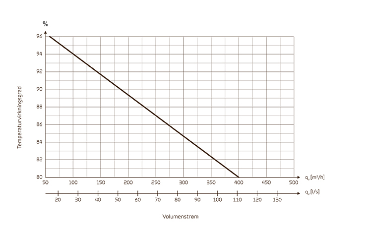 TemperaturwirkungsgradTemperaturwirkungsgrad als Funktion des Volumenstroms qv [m3/h] für Gerät mit Gegenstromzähler. Temperaturwirkungsgrad nach EN13141-7 (2°C / 20°C). NB! Der Temperaturwirkungsgrad ist für den Gegenstromwärmetauscher allein (ohne Wärmepumpebetrieb). |