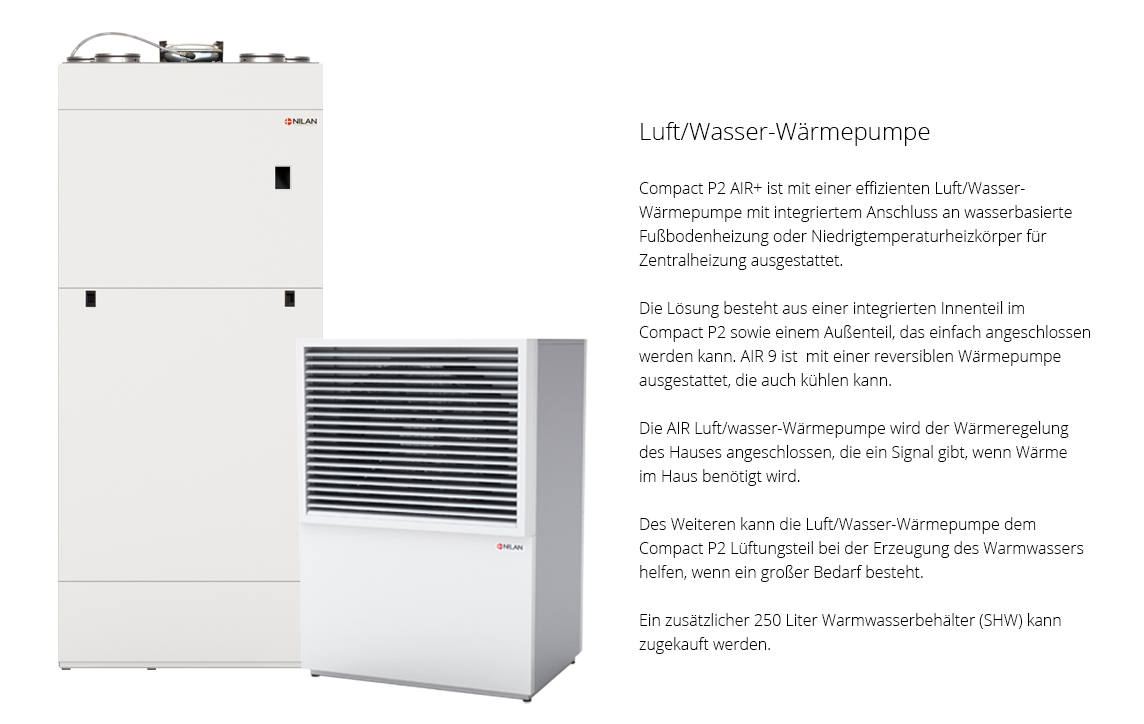 Compact P2 Air9 ist eine kompakte Einheit mit allen Funktionen der Haustechnik, ein hoch effizientes Multigerät mit den Funktionen Lüften, Heizen, Kühlen, Warmwasser und einer integrierten Wärmepumpe für die Fußbodenheizung.
