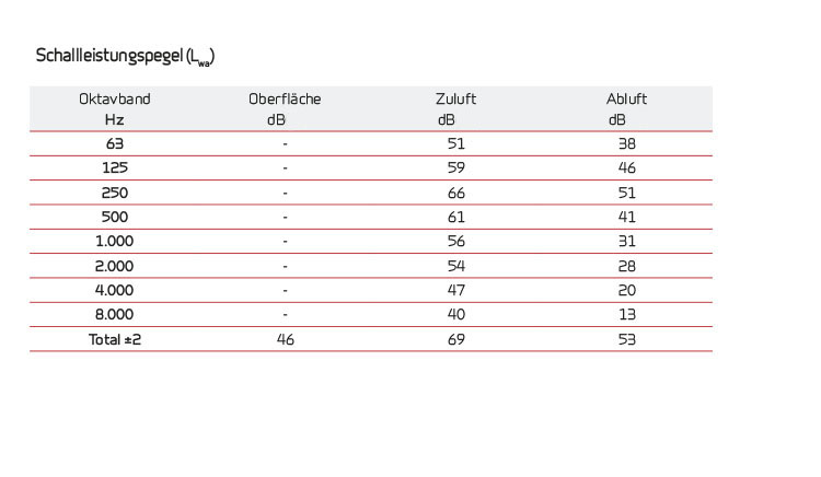 SchalldatenSchallwerte gelten für qv = 210 m3/h und Pt, ext = 100 Pa, gemäß EN 9614-2 für Oberflächen und EN 5136 für Kanäle. Der Schallleistungspegel LWA sinkt bei abnehmender Luftmenge, bzw. abnehmendem Gegendruck. Der Schalldruckpegel LpA, bei einem gegebenen Abstand von den akustischen Verhältnissen am Installationsort abhängig. |