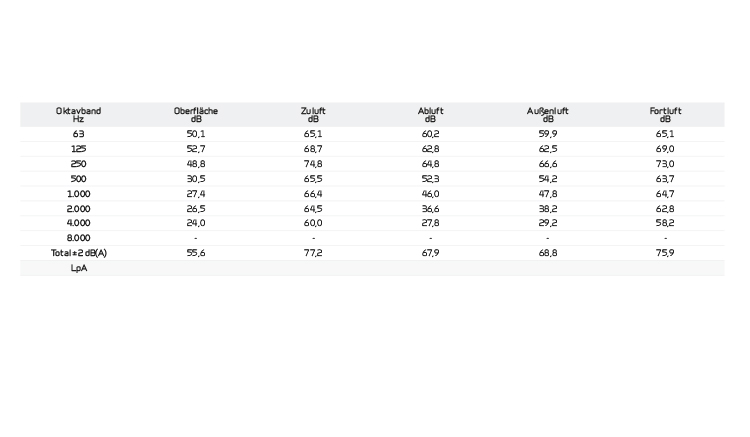 Schalldaten gelten für qV = 1200 m3/h und Pt, ext = 200 Pa nach EN 9614-2 für Oberflächen und EN 5136 für Kanäle.