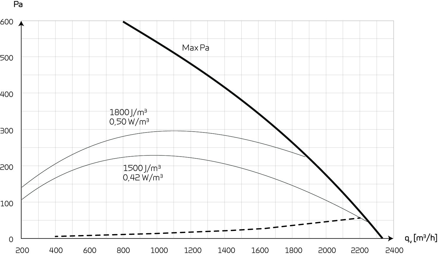 Leistung (Kondensationstauscher)Die folgenden Daten werden auf Basis eines Kondensationstauschers berechnet. Leistung eines Standardgerätes als Funktion von qv og Pt, ext. Elektroeffizienz nach EN 13053 gilt für Standardgeräte mit ISO ePM10 >60% (M5) und ISO ePM1 50% (F7) Filtern und ohne Heizregister. Achtung! SFP-Werte werden gemessen und als Gesamtwert für beide Ventilatoren angegeben. |