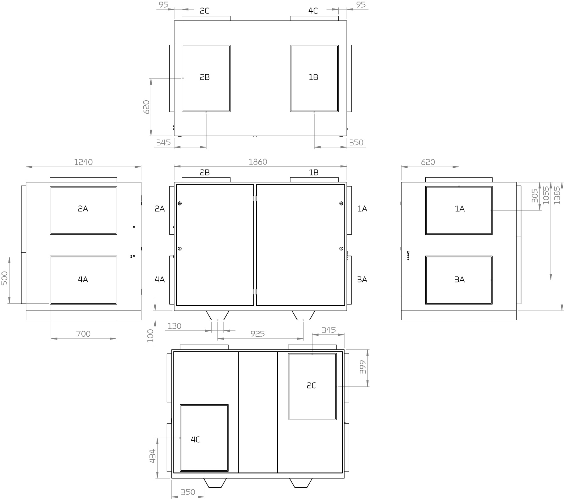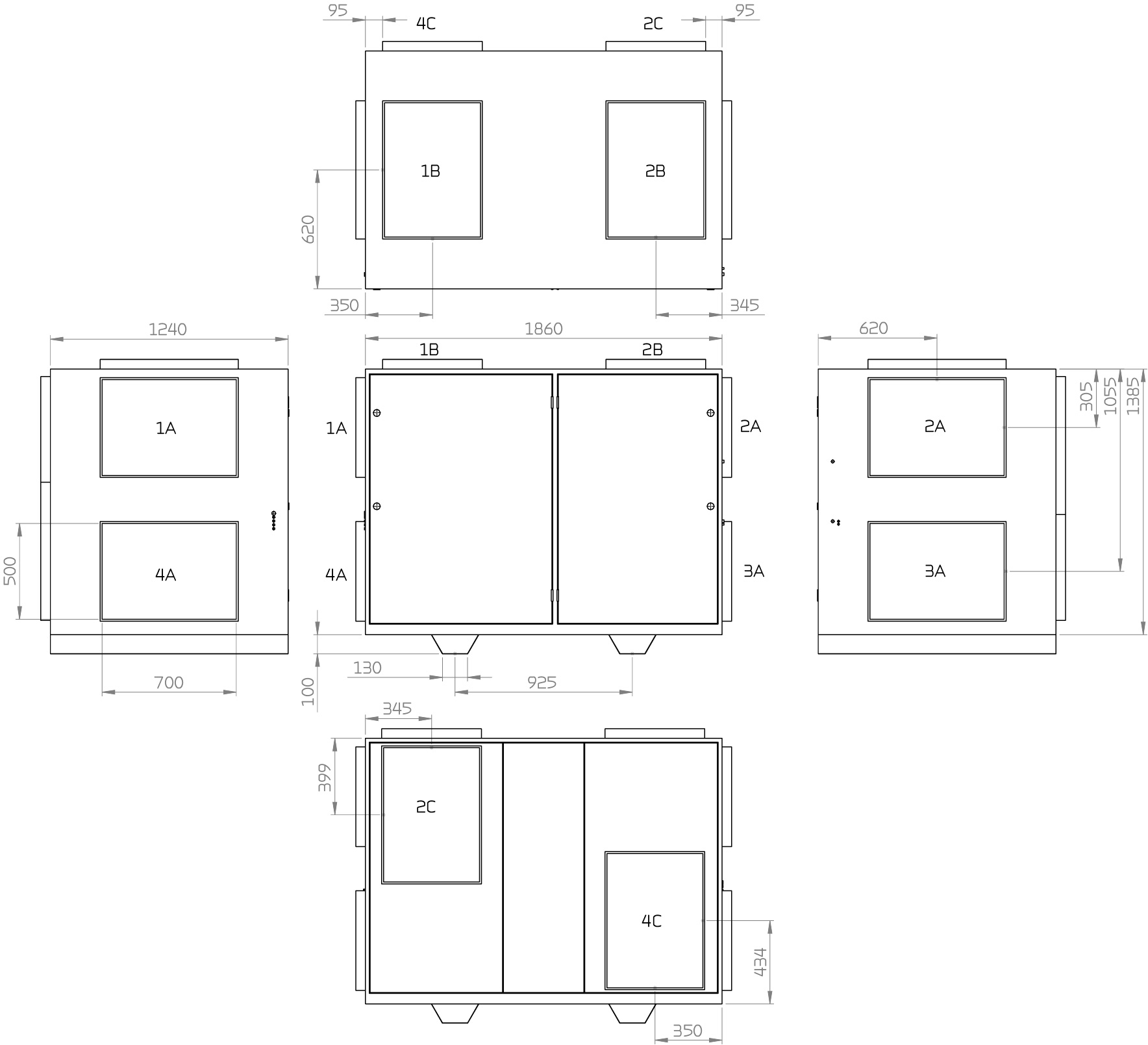 Die Konstruktion der VR-Serie mit selbsttragendem Rahmen und 50 mm Isolierung sorgt für ein robustes und kompaktes Gerät, das sich problemlos in Technikräumen mit begrenztem Platzangebot aufstellen lässt. Flexible Stutzenpositionen und universelle Anschluss-möglichkeiten erleichtern die Anpassung der Installation an das Gebäude.