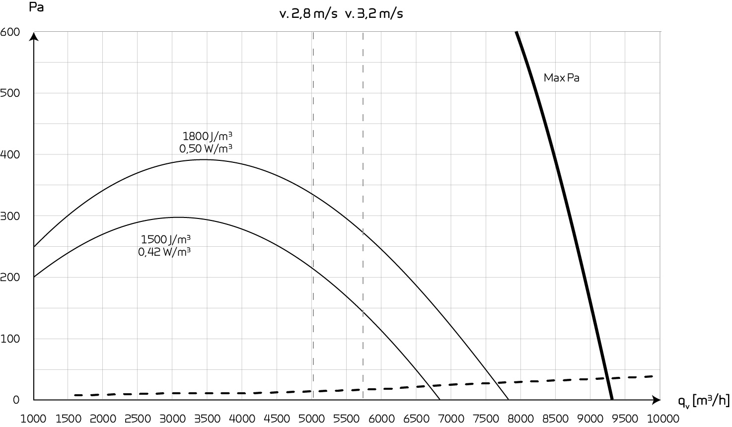 Leistung (Kondensationstauscher)Die folgenden Daten werden auf Basis eines Kondensationstauschers berechnet. Leistung eines Standardgerätes als Funktion von qv og Pt, ext. Elektroeffizienz nach EN 13053 gilt für Standardgeräte mit ISO ePM10 >60% (M5) und ISO ePM1 50% (F7) Filtern und ohne Heizregister. * Die Luftgeschwindigkeit über der Verdampferoberfläche wird bei Meter pro Sekunde gemessen. Achtung! SFP-Werte werden gemessen und als Gesamtwert für beide Ventilatoren angegeben. |