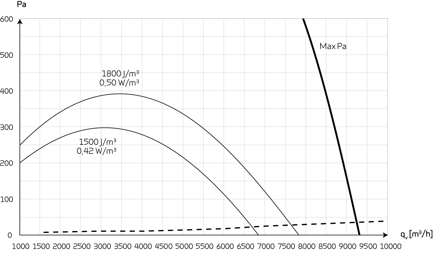 Leistung (Kondensationstauscher)Die folgenden Daten werden auf Basis eines Kondensationstauschers berechnet. Leistung eines Standardgerätes als Funktion von qv og Pt, ext. Elektroeffizienz nach EN 13053 gilt für Standardgeräte mit ISO ePM10 >60% (M5) und ISO ePM1 50% (F7) Filtern und ohne Heizregister. Achtung! SFP-Werte werden gemessen und als Gesamtwert für beide Ventilatoren angegeben. |